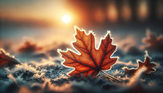 Frosty autumn leaves in sunrise light outdoors