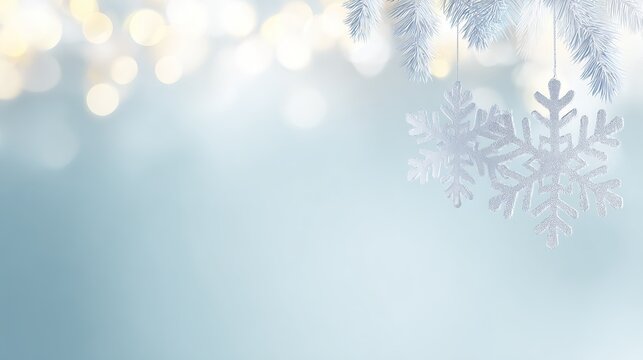 Christmas snowflake ornaments, hanging on frosty pine branches with bokeh lights, soft blue background, close-up view, copy space