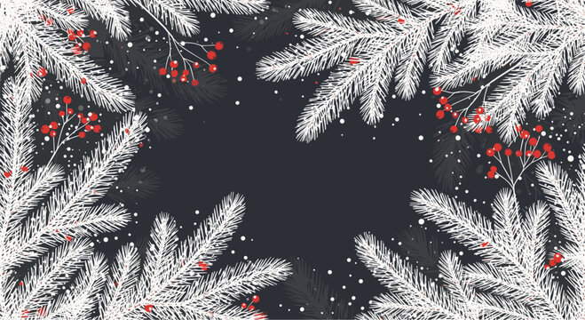 Festive Christmas or winter background with a frame of snow-covered white pine branches and red berries on a dark grey backdrop.