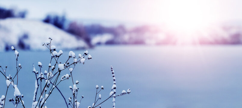 Winter landscape with snow-covered dry plants on the river bank in sunny weather during sunset