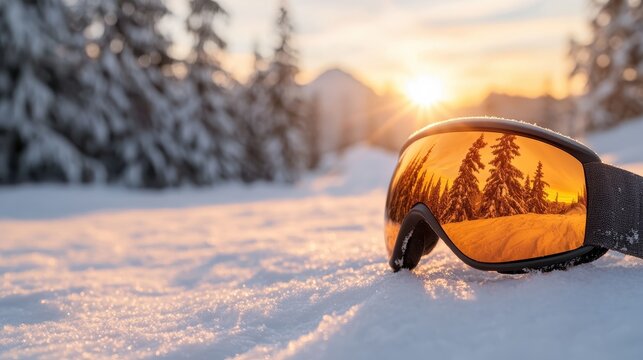 A pair of ski goggles rests on fresh snow, reflecting the stunning sunrise and frosty trees, evoking a sense of adventure and excitement in winter sports.