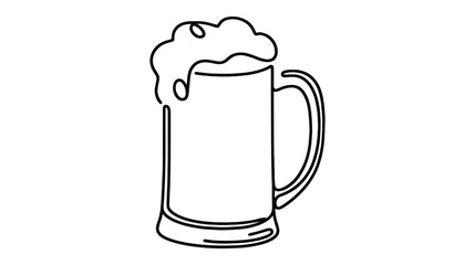 One continuous line illustration of a beer mug with overflowing foam, isolated on white background.