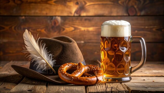 A frothy beer mug sits beside a pretzel and a traditional Bavarian hat with a feather on a rustic wooden surface.