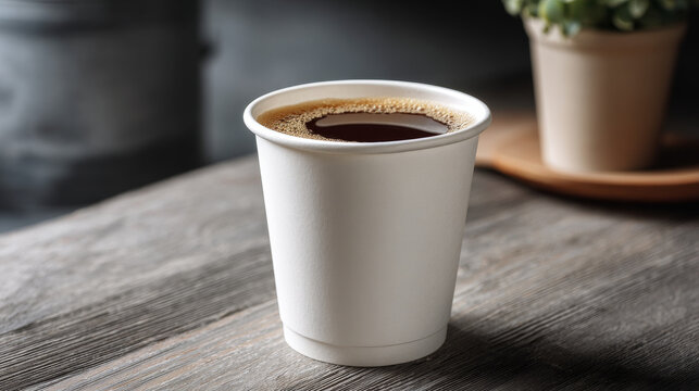 Barista preparing cappuccino pouring milk foam making latte art in takeaway paper cup in a cafe