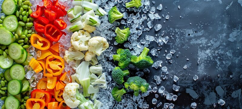 Assortment of frozen vegetables on ice. Food supplies. View from above. place for text.