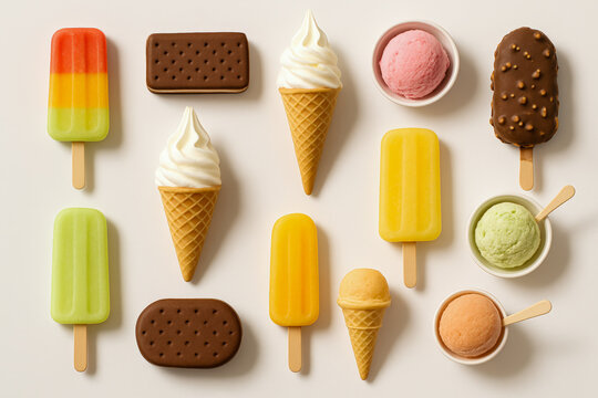 Top-down flat lay of colorful assorted frozen desserts including popsicles, soft serve cones, ice cream bars, scoops in bowls, and ice cream sandwiches on a neutral background—perfect for food concept