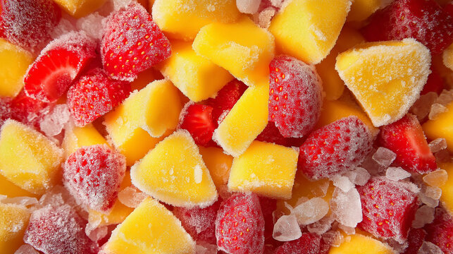 Close-up of frozen strawberries and mango chunks resting on ice. The frosty texture and vibrant colors highlight freshness, making them perfect for smoothies, desserts, and healthy snacks