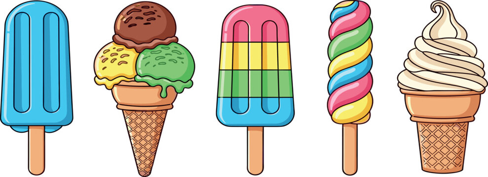 A delightful collection of colorful frozen desserts, including various ice cream cones and popsicles, perfect for summer treats and sweet refreshment, rendered in a vibrant cartoon illustration style