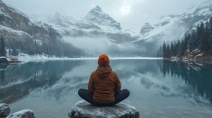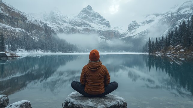 On a cloudy day, a young hiker meditates on a rock in front of a beautiful frozen lake with snowy mountains reflecting.