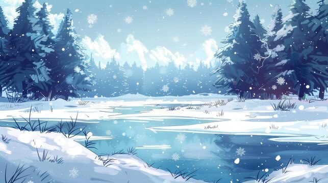 A beautiful winter landscape with a frozen lake, snow-covered trees, and mountains in the distance. The sun is shining brightly, and the air is crisp and clear.