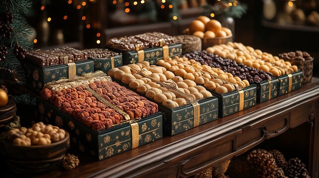 New Year greeting setup with luxury dry fruit boxes golden accents fairy lights and greeting cards radiating joy and celebration for new beginnings
