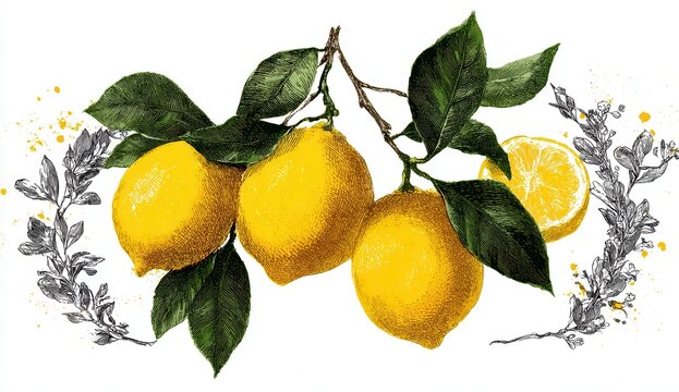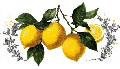 Vibrant lemons with leaves and decorative accents in a vintage style.