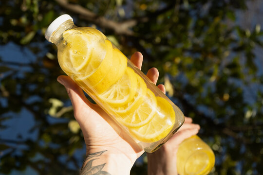 Super Slow Motion Shot of Fresh Lime Slices Falling into Water Whirl at 1000 fps.