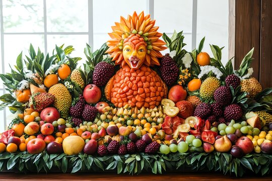 A colorful fruit and vegetable display featuring a carved lion.