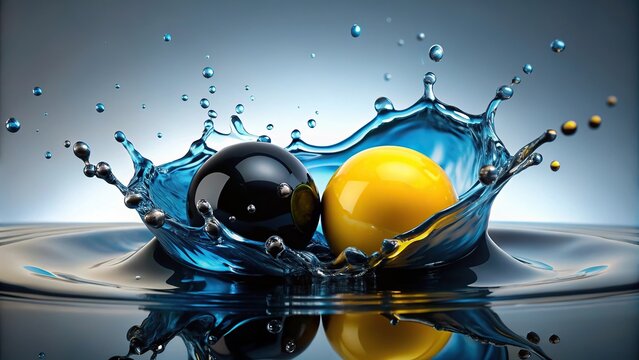 Two fresh lemons collide in water, creating dynamic splashes and energetic movement in a vibrant, refreshing scene.