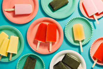Overhead view of fruit popsicles on plates