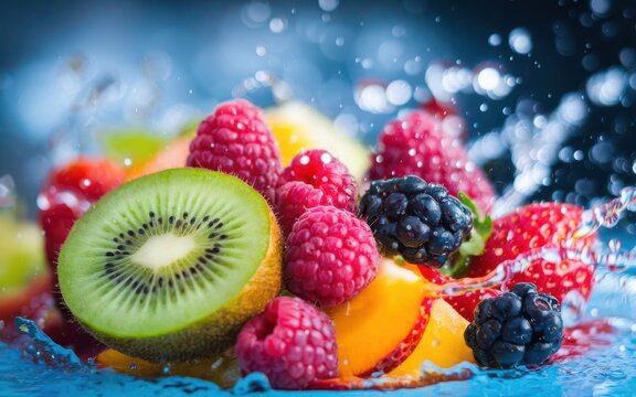 A symphony of vibrant colors, a burst of juicy freshness, and a symphony of sweet flavors create a tantalizing visual feast as a splash of liquid envelopes a cluster of berries and fruits.