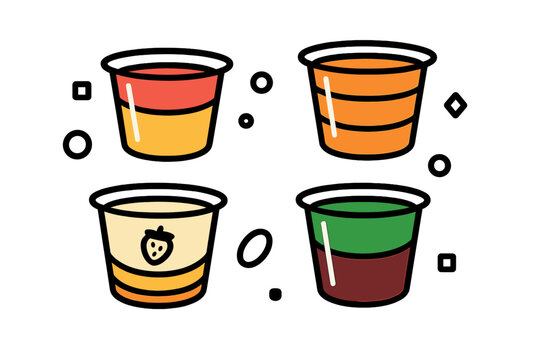 Colorful jelly cups icon set with layered fruit flavors and a strawberry symbol isolated on a white background