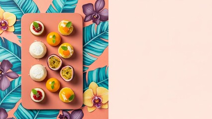 Tropical mini desserts with creamy bases, fresh passion fruit, and exotic fruit flavors
