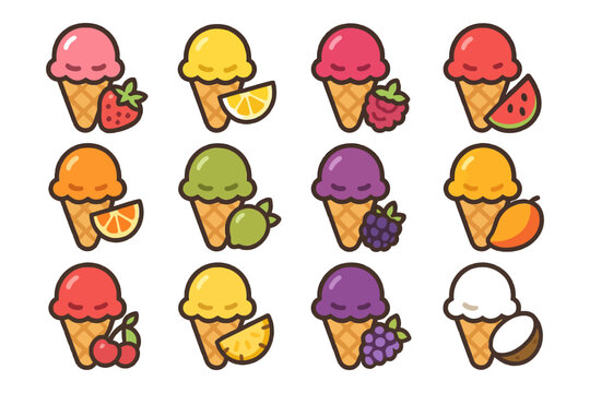 Colorful assortment of ice cream scoops arranged neatly on a white background showcasing a variety of flavors including fruit and chocolate for dessert lovers