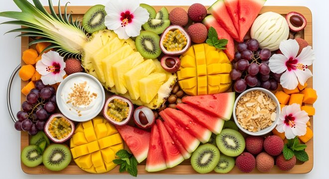 Vibrant tropical fruit platter overflowing with exotic flavors and colors, perfect for a healthy celebration.