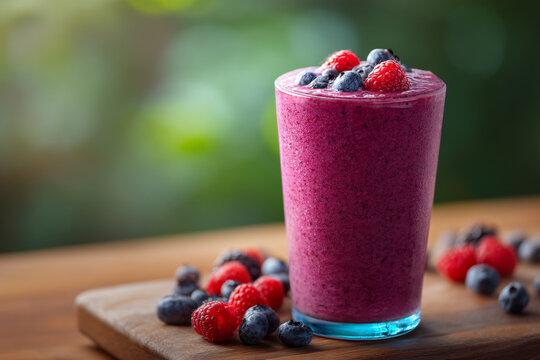 A vibrant freshly made smoothie in a glass, garnished with berries, sitting on a kitchen island, promoting a healthy start.