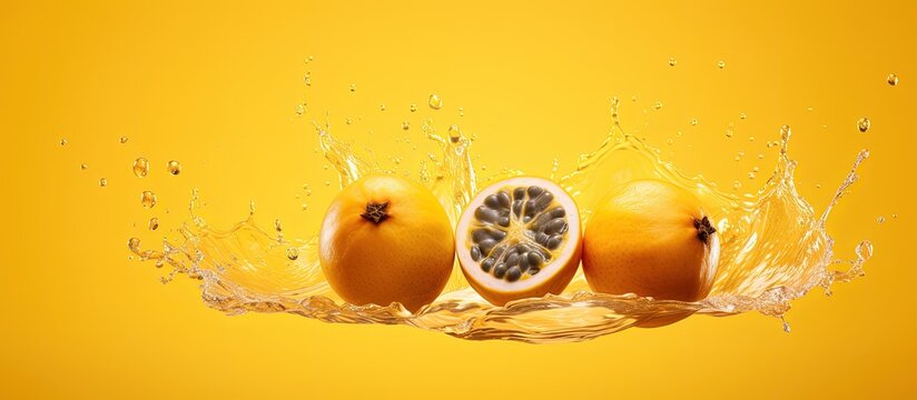 Raw passion fruit levitating in yellow background representing zero gravity and high resolution imagery