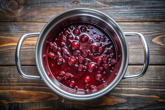 red fruit jam in cooking steel pot on kitchen table top view