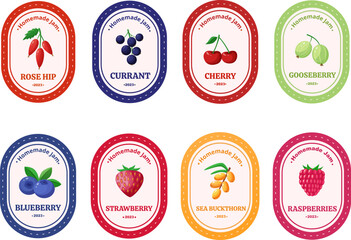 Berries jam stickers. Harvest products typography labels design. Decorative sticker with berry, cherry, strawberry nowaday vector template