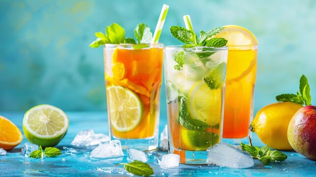 Refreshing summer drinks including fruit and citrus lemonades or cocktails on a bright, vibrant background