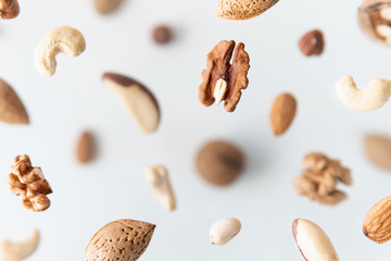 Assorted nuts flying above white background, levitation effect