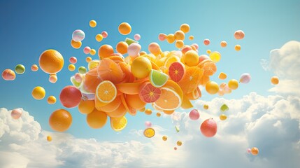 Colorful Summer citrus fruit flying on a cream background. Juicy aesthetic party concept. Orange, grapefruit, lemon, kiwi floating.