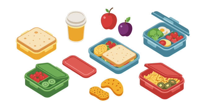 Colorful isometric lunchbox illustrations with fruits and snacks for healthy meal themes