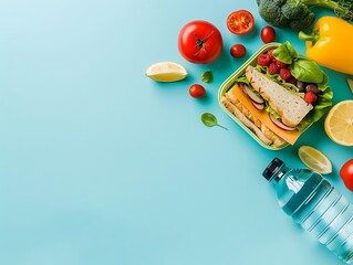 Healthy school lunch box with fruits, vegetables, sandwich, nuts on wooden table. Kids lunchbox top view
