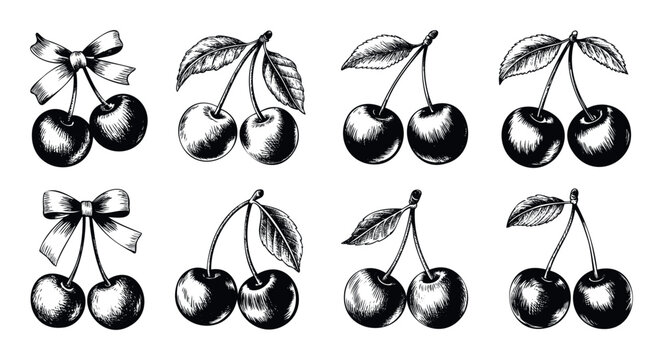 Collection of hand drawn cherry fruit illustrations in an engraved style perfect for vintage food packaging designs recipe books or summer themed graphic resources
