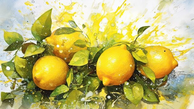 Vibrant lemon watercolor pattern with blue foliage for creative design