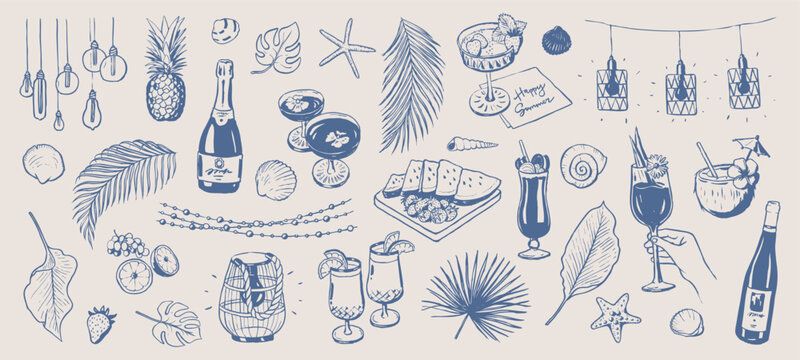 Summer beach party doodle elements. Summer lights, boho garland. Holiday drawings. Hand drawn illustration of drinks, cocktails, palm leaves, shells and fruits isolated. Graphic sketches background.