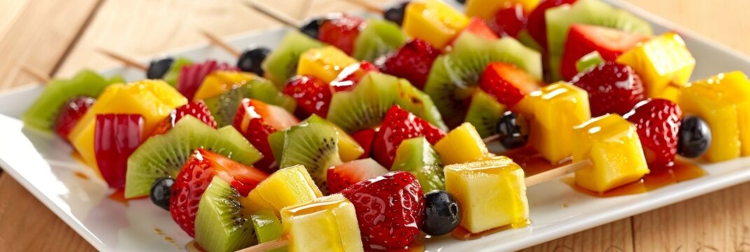 A platter of colorful fruit skewers drizzled with a honeylime glaze.