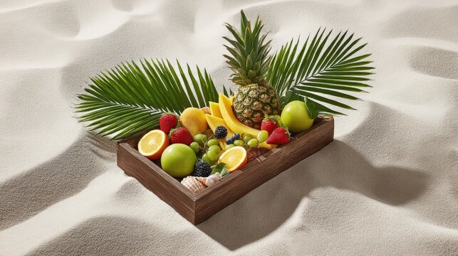 A bright summer tabletop scene featuring a tropical fruit platter, placed on a wooden or rattan table on sand, surrounded by tropical props like palm leaves, citrus fruits, and shells, natural