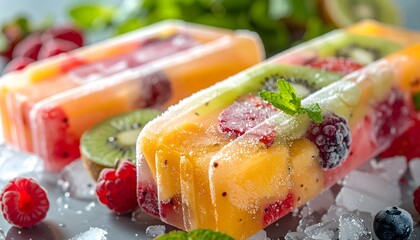 Fresh fruit popsicles on ice with mint