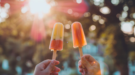 Two hands holding colorful fruit popsicles against a sunlit, bokeh background.