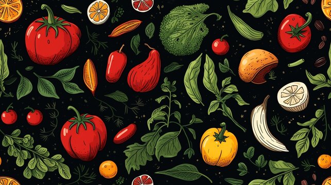 A seamless pattern of hand-drawn vegetables and fruits on a black background