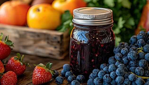 Fruit Preserve Delight with Strawberries Grapes and Plums beside Rustic Box on Weathered Wooden Table