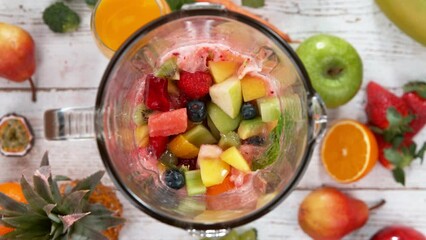 Fresh fruit and vegetables smoothie blended in blender, top view. Healthy eating concept. Super slow motion filmed on high speed cinematic camera.