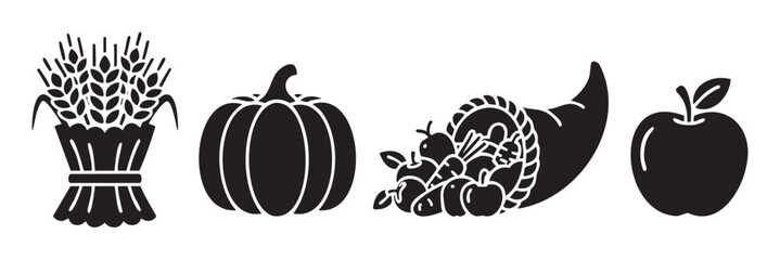 Collection of black food and meal icons showing various lunch items like a sandwich, salad, fruit, and bento box, along with symbols for safety and time management
