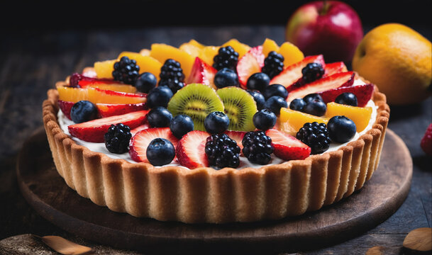 a meticulously arranged fruit tart with colorful berries and a glossy finish, looking like an edible masterpiece