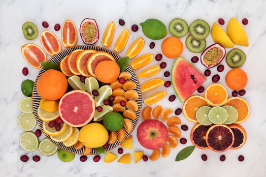 Tropical & citrus fruit for immune system boost high in antioxidants, fibre, anthocyanins, lycopene, vitamins & minerals. Natural healthcare concept.  Flat lay on marble.