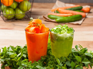 Beautifully decorated freshly prepared carrot and cucumber juice glasses on a tray filled with various edible greens on wooden table  with other fruits and vegetables in the background