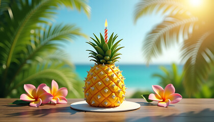 Creative birthday cake shaped like a pineapple with a candle and decorated with tropical flowers in a sunny beach setting