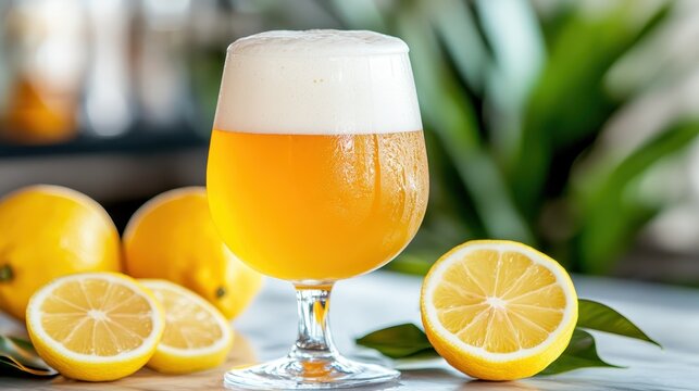 A refreshing glass of lemon beer sits surrounded by fresh lemons, highlighting the zesty flavors and vibrant appearance that makes for a perfect summer drink.